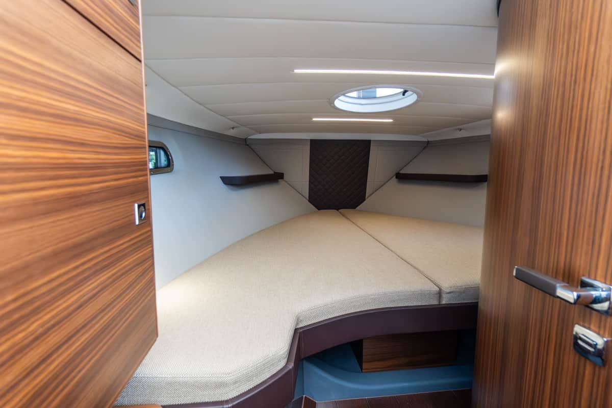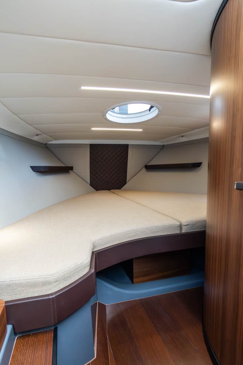 Al adentrarse en su lujoso interior, quedará cautivado por la calidez y elegancia de los acabados en madera American Walnut. El confort se une al lujo con detalles como el cabecero de la cama acolchado y los pomos forrados en piel. Cada elemento ha sido seleccionado pensando en su comodidad y placer.